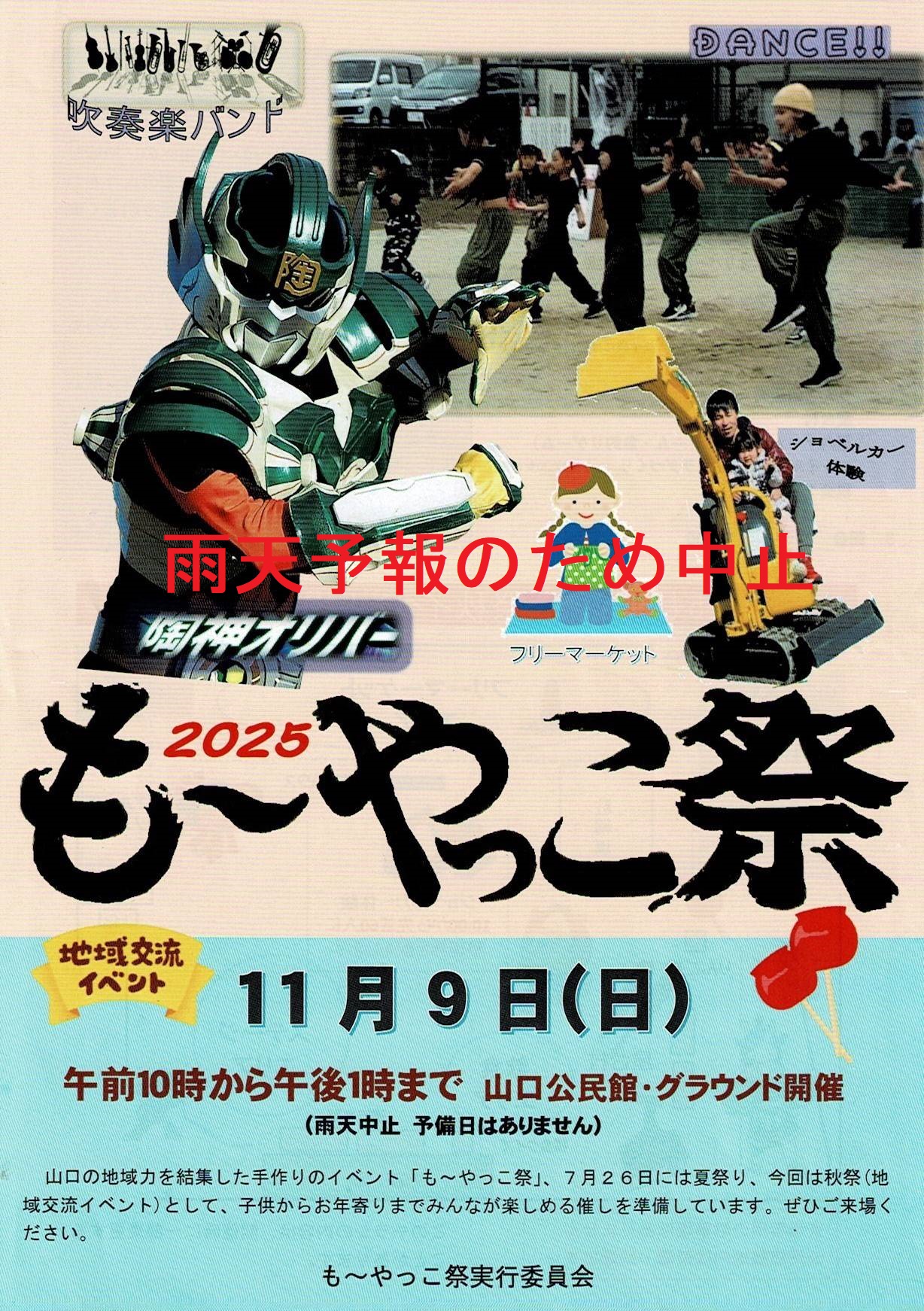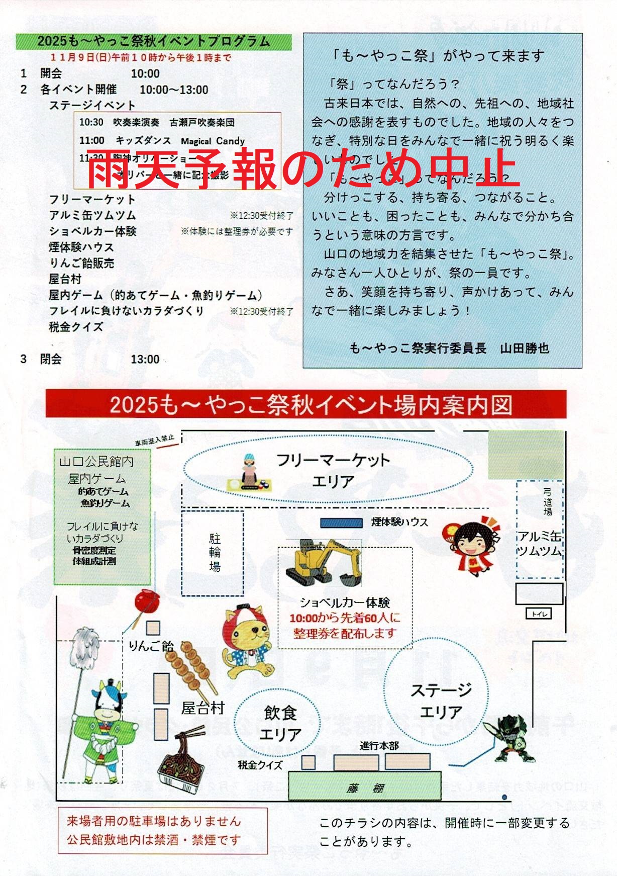 • ・令和7年11月9日(日曜日)「も~やっこ祭(秋イベント)は雨天予報のため中止となりました。
